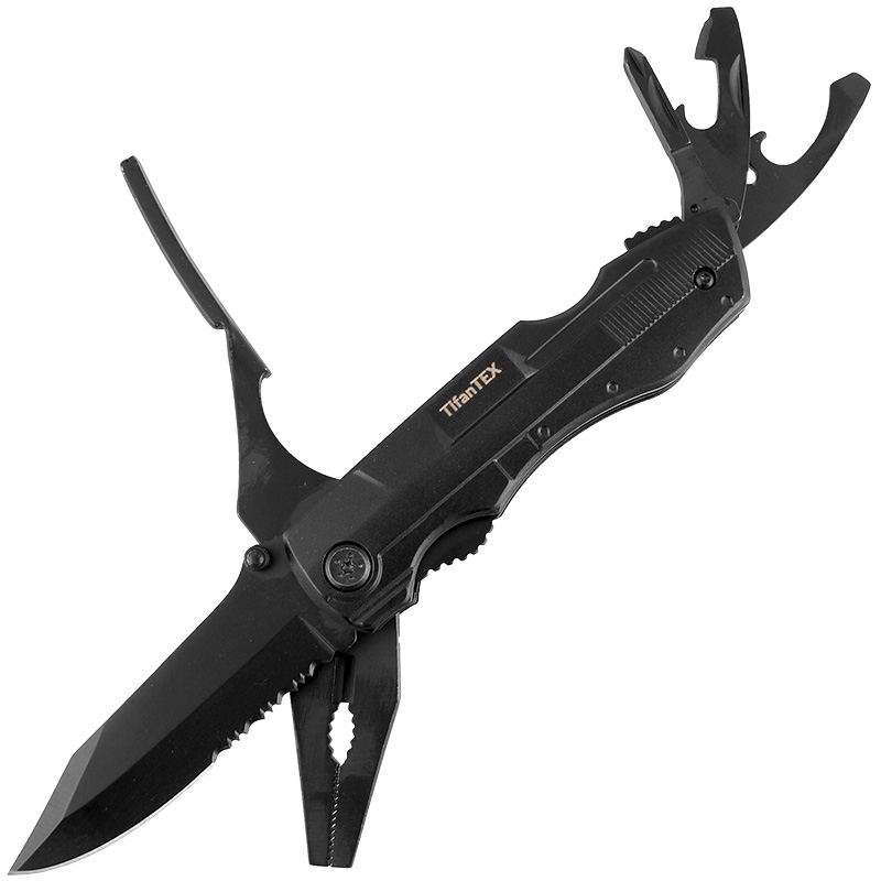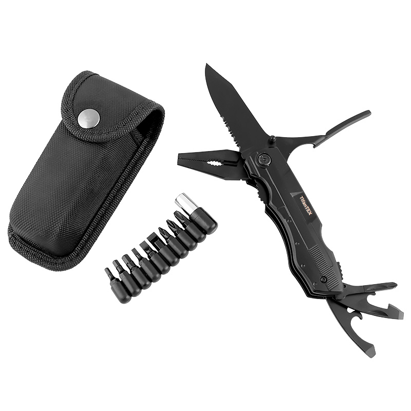 Briceagul multifuncțional TFT fiabil va deveni un instrument ideal pentru garajul, mașina sau echipamentul de drumeție al dvs. Este ideal pentru mici reparații atât în interior, cât și în exterior. Dimensiunea sa optimă vă permite să îl puneți în orice buzunar, astfel încât să îl aveți întotdeauna la îndemână. În plus, instrumentul conține o teacă neagră din cordura care poate fi prinsă la cureaua pantalonilor. Briceagul multifuncțional negru are unelte fabricate din oțel inoxidabil 420. Acest material este extrem de durabil și rezistent la condiții meteorologice dificile. În plus, oțelul este acoperit cu un strat protector negru care arată elegant și reduce efectul reflectorizant. Mânerul confortabil, profilat ergonomic, este fabricat din oțel acoperit cu căptușeli dintr-un material foarte durabil și plăcut. Instrumentul multifuncțional are până la 17 funcții, inclusiv cuțit, clește, șurubelniță și deschizător de conserve și sticle. Acesta este un articol perfect pentru orice meșter, supraviețuitor sau reparator.