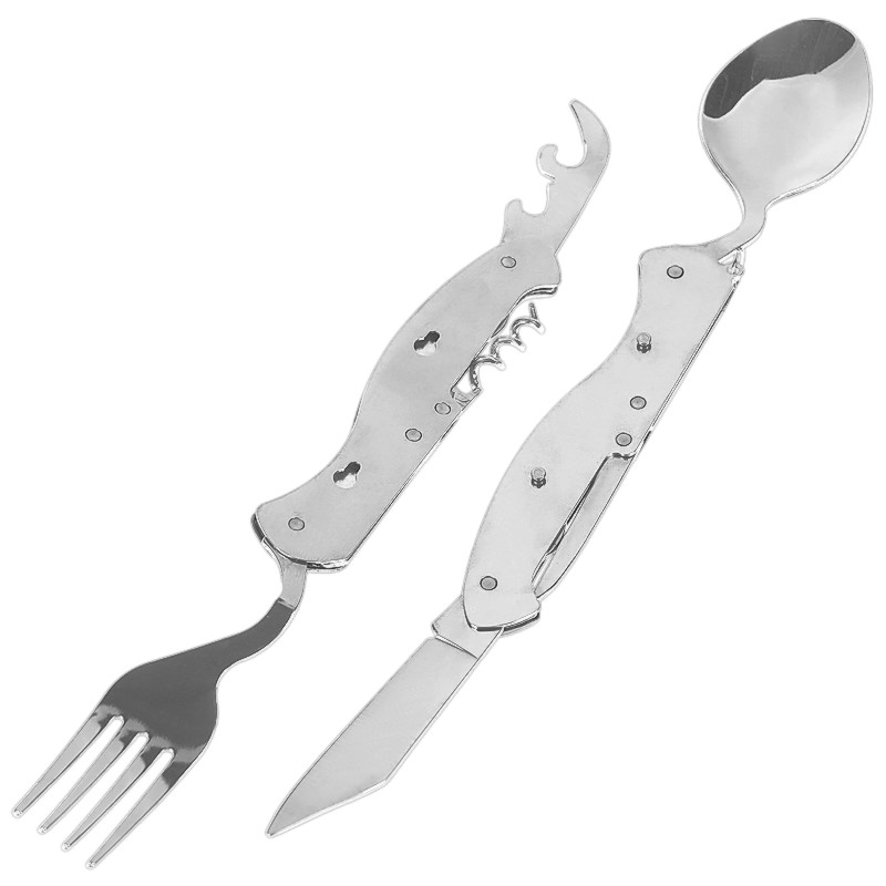Briceag multifuncțional cu tacâmuri care, datorită dimensiunii sale compacte, încape aproape oriunde și vă permite să vă bucurați de fiecare masă în natură fără a fi nevoit să vă luați tacâmuri de bucătărie neîndemânatice și inutil de mari. Furculița, cuțitul și lingura sunt toate fabricate din oțel inoxidabil, ideal pentru tacâmuri, deci acestea sunt tacâmuri clasice într-un design mai mic și mai portabil. Briceagul este fix în starea sa de bază, dar deschiderea deschizătorului permite briceagului să se desfacă, astfel încât să puteți ține furculița într-o mână și cuțitul în cealaltă. Ulterior, asamblarea părților briceagului necesită închiderea deschizătorului în timp ce ambele părți ale briceagului sunt în locurile în care erau înainte de deschidere. Uneltele suplimentare, cum ar fi un tirbușon sau un deschizător de sticle, sunt accesorii suplimentare pentru un briceag deja practic, la un preț avantajos, care nu poate lipsi din nicio excursie în pădure sau la un grătar.