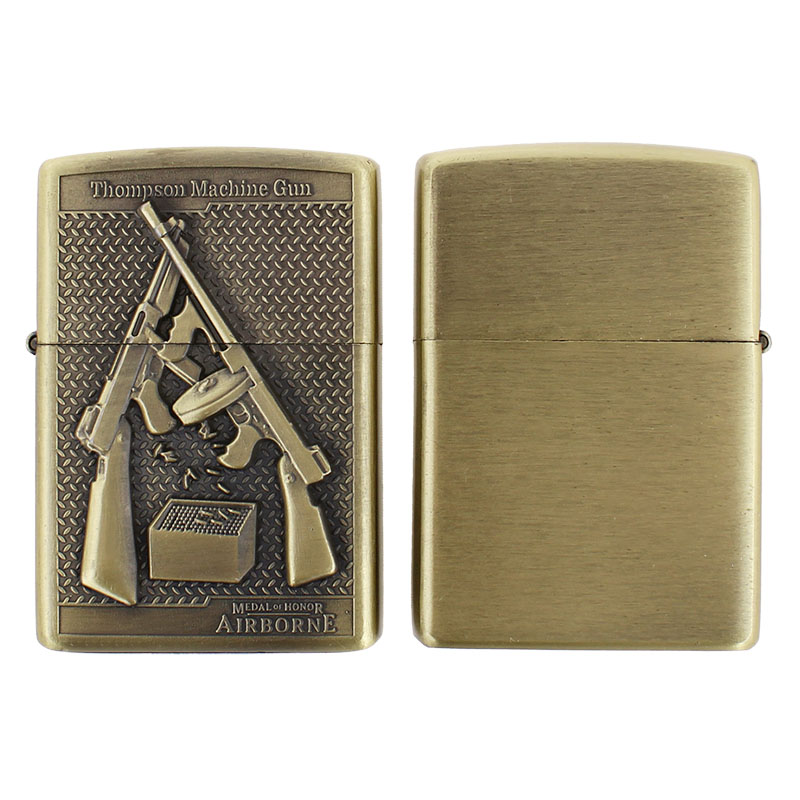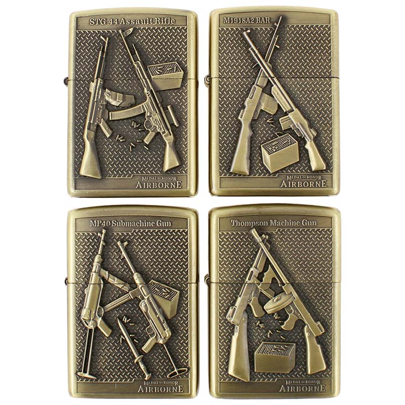Brichetele pe benzină, livrate într-un set de 4 bucăți din alamă, vor bucura cu siguranță orice pasionat de arme de foc care are și plăcerea fumatului. Fiecare brichetă are un design unic cu diverse arme, realizat în variantă 3D. Brichetele pe benzină se remarcă și prin frumoasa lor culoare aurie antică, care le conferă un aspect elegant și o valoare de colecție. În acest caz este vorba despre brichete practice, cu sistemul clasic „cu rotiță” pentru aprinderea focului, care nu dezamăgește nici în condiții meteorologice sau termice nefavorabile.