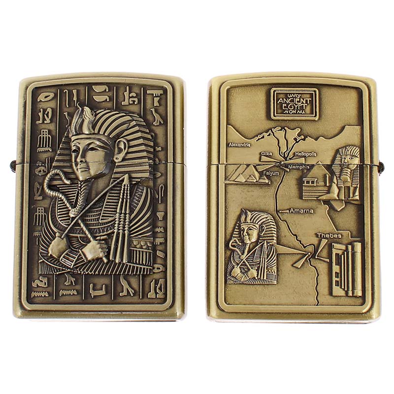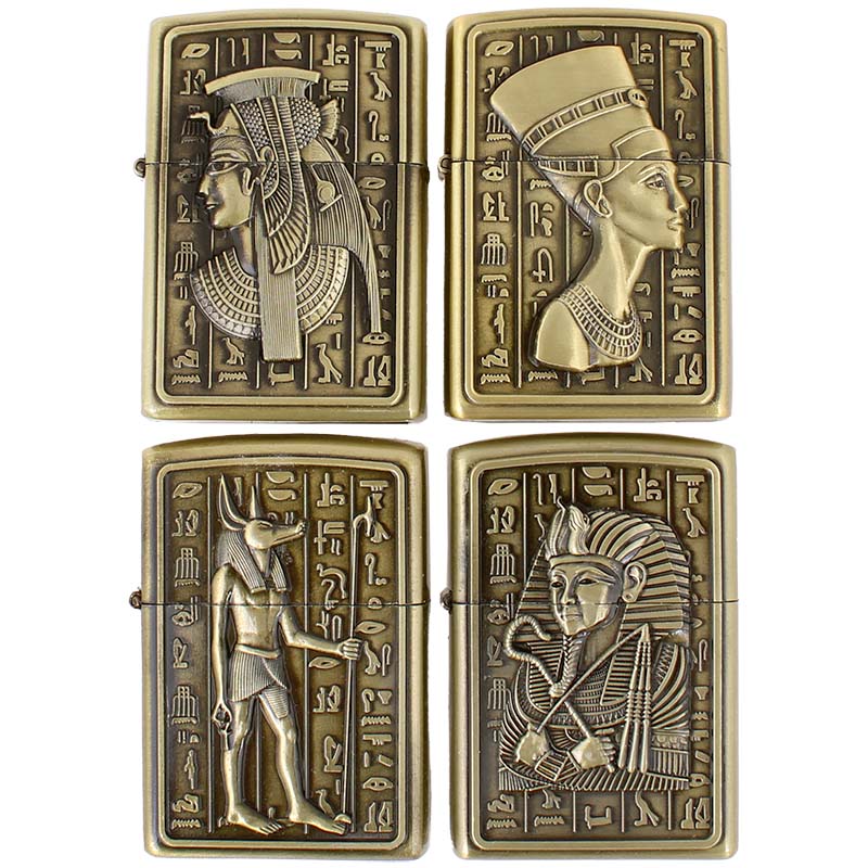 Brichetele pe benzină, livrate într-un set de 4 bucăți din alamă, vor bucura cu siguranță orice fumător. Fiecare brichetă are un design unic cu faraoni egipteni și hieroglife. Brichetele se remarcă și prin culoarea lor frumoasă, aurie antică, care le conferă un aspect elegant și o valoare de colecție. Este vorba despre brichete practice, cu sistem clasic „cu rotiță” pentru aprinderea focului, care nu dezamăgește nici în condiții meteorologice sau termice nefavorabile.