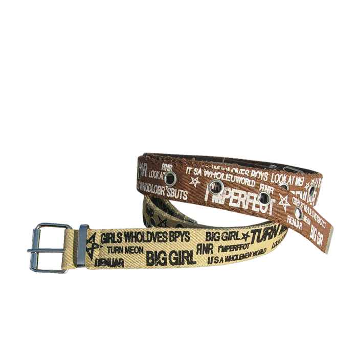 Specificație: curea sport din pânză, imprimată cu sloganuri englezești, cu cataramă de oțel pentru prindere pe un singur rând, cu găuri mari