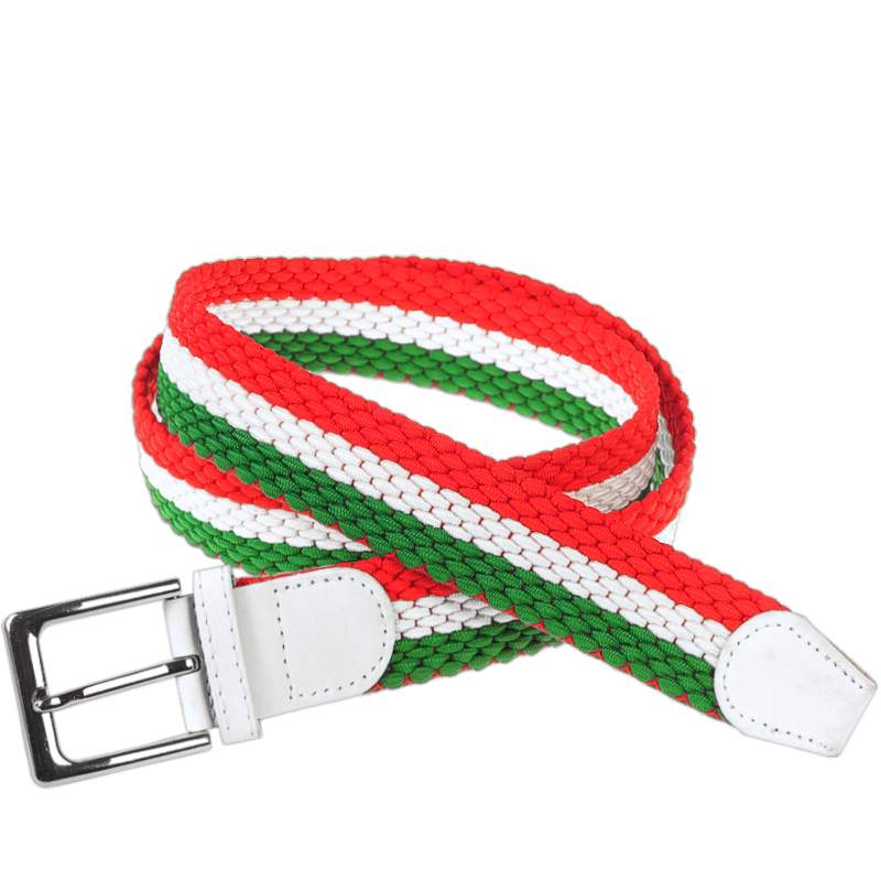 Curea elastică cu cataramă în culorile roșu, verde și alb, adică culorile steagului Ungariei pentru toți iubitorii acestei țări. Cu puțină creativitate cureaua poate reprezenta nu numai Ungaria, ci și Italia sau Mexic. Această curea a fost realizată din fibre flexibile, al căror avantaj este capacitatea de a atașa catarama în orice loc de pe ea, fără a fi nevoie să se creeze găuri pentru tija metalică de pe cataramă. Fibrele flexibile ale acestei curelei transformă o centură obișnuită, statică, într-una mai elastică și mai adaptabilă, care nu are nicio problemă în adaptare la o circumferință mai mare a taliei.