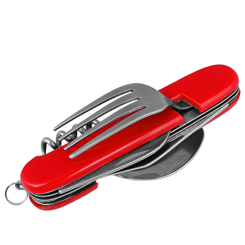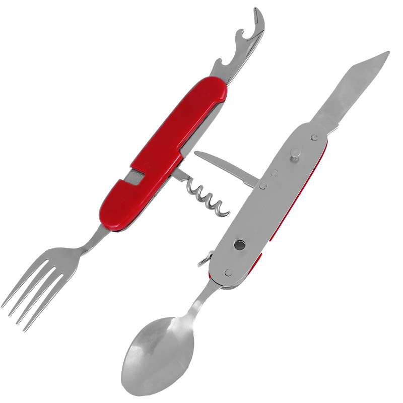 Cuțit practic de buzunar cu șase funcții: lingură, cuțit, furculiță, deschizător de sticle, tirbușon și inel din oțel inoxidabil pentru chei. După deschiderea furculiței și a lingurii mari, cuțitul se separă practic în două părți, permițând utilizarea separată a furculiței, lingurii sau cuțitului. Este un ajutor practic potrivit pentru activități în aer liber, camping, drumeții, călătorii, pentru culegători de ciuperci sau pescari, dar și pentru uz zilnic.