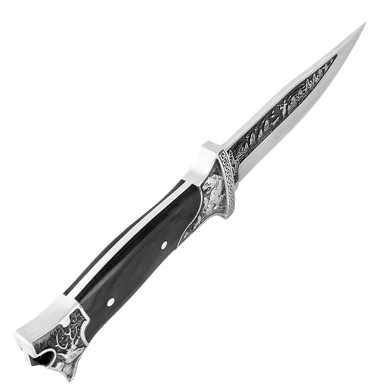 Cuțit de vânătoare elegant pentru fanii culturii și tradiției de vânătoare. Este bogat decorat cu numeroase ornamente, frumos lucrate. Cuțitul are o construcție full tang, care este extrem de puternică și rezistentă la eventualele deteriorări. Lama cu profil tradițional clip point, precum și părțile lamei sunt fabricate din oțel inoxidabil 440 de înaltă calitate. Acest material este extrem de rezistent la abraziune și are proprietăți anti-coroziune ridicate. Lama este gravată pe ambele părți cu ornamente de vânătoare și parțial înnegrită. Mânerul tradițional este fabricat din metal acoperit cu lemn. Pe partea din spate a cuțitului se află o gaică pentru înșirarea unui șnur. Setul include o teacă neagră din cordura care poate fi prinsă la o curea. Cuțitul de vânătoare bogat decorat este cadoul perfect pentru un vânător.