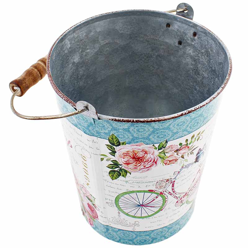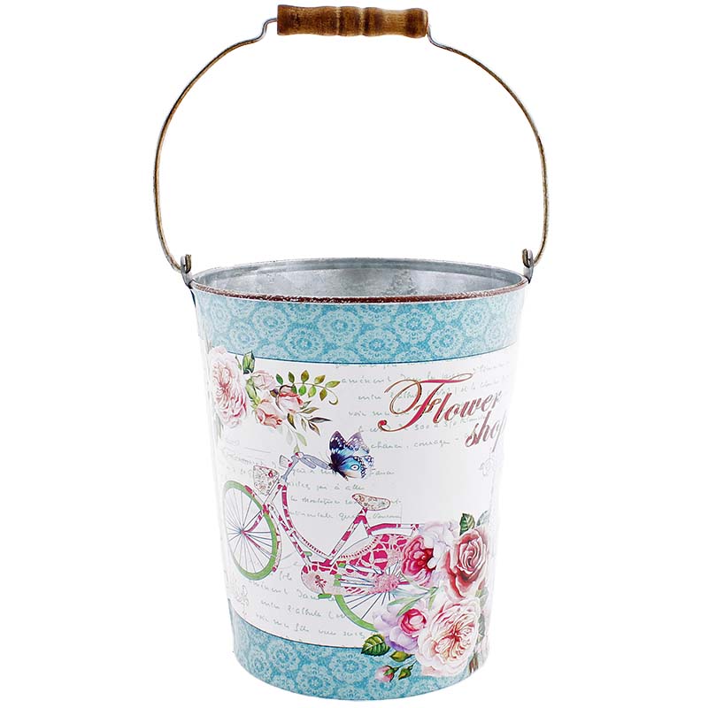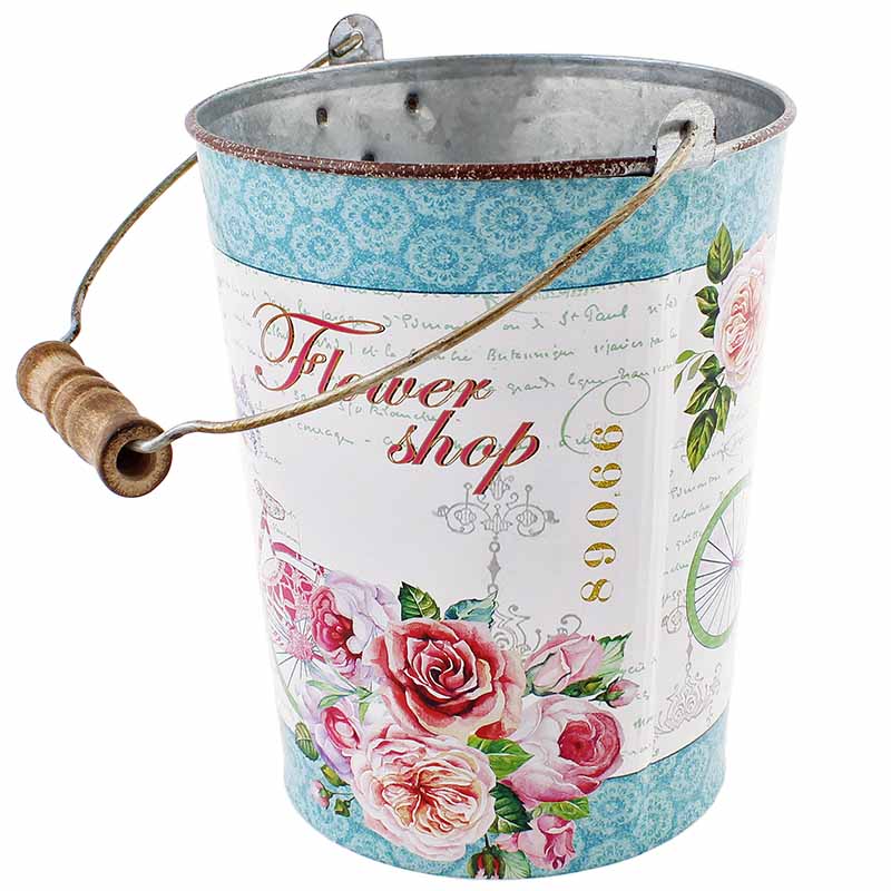 Printre decorațiunile pentru apartament, dar și pentru grădină, se numără această găleată vintage pentru flori sau alte obiecte. Găleata este decorată cu un imprimeu în stil vintage, cu diverse flori și inscripții. Poate fi utilizată pentru aranjarea decorațiunilor de grădină sau ca un ghiveci elegant pentru flori. Înălțimea găleții este de 17 cm, iar diametrul său este de 13 cm.