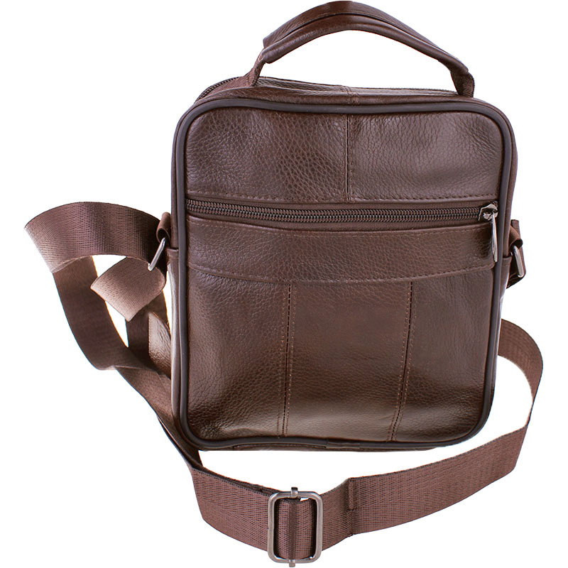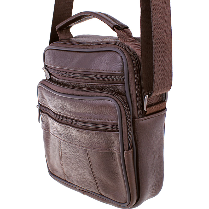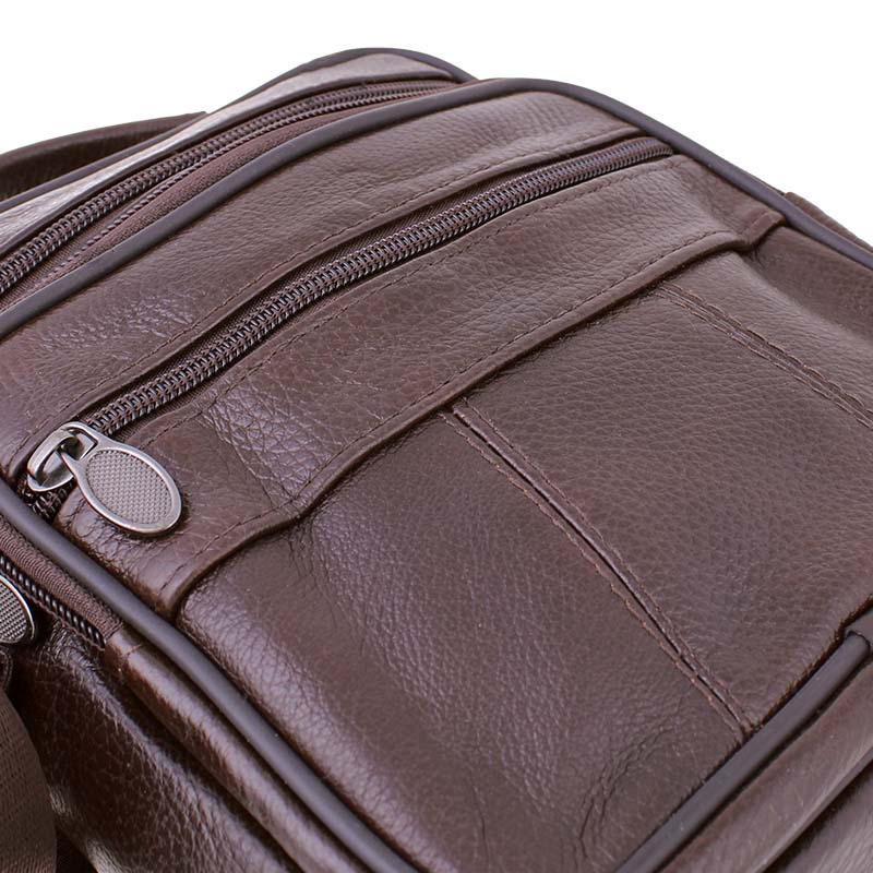Geanta bărbătească din piele purtată pe umăr, de culoare maro, oferă suficient spațiu de depozitare, precum și o durabilitate îndelungată. Geanta are în total șase compartimente cu închidere cu fermoar. Pentru fabricarea genții a fost folosită piele naturală, datorită căreia geanta este suficient de rezistentă și hidrofugă. Datorită dimensiunilor sale, în geantă pot fi depozitate diverse obiecte personale, bunuri de valoare sau chiar gustări, inclusiv o sticlă PET de 500 ml de dimensiune medie. Curea de umăr este reglabilă. Geanta dispune și de un mâner în partea superioară, ceea ce permite transportarea confortabilă în mână.