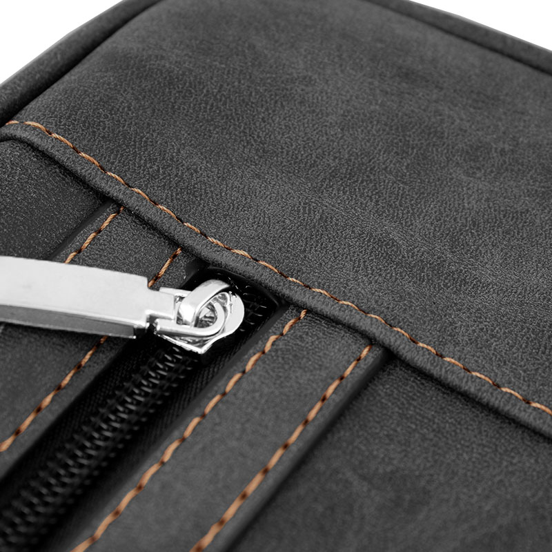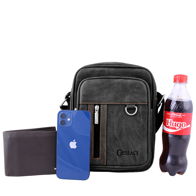 Geantă de umăr pentru bărbați, din piele, în nuanță elegantă de negru. Dispune de un compartiment principal spațios, poziționat central, cu închidere pe fermoar, ce include două buzunare suplimentare pentru documente – unul cu fermoar și unul separat printr-un strat de poliester. În compartimentul principal încap cu ușurință telefonul, portofelul și chiar o sticlă de plastic de 0,5 l. Pe partea din spate se află un buzunar cu fermoar, iar în față – o compartimentare suplimentară cu o cameră mai mare și una mai mică, ambele cu închidere pe fermoar. Cureaua de umăr este ajustabilă până la 1,4 m, făcând geanta practică și versatilă pentru uz zilnic.