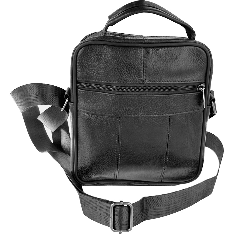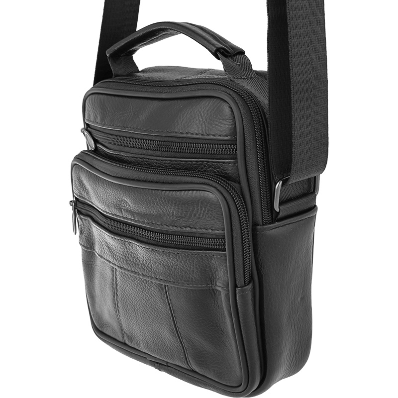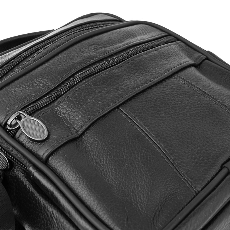 Geanta bărbătească din piele purtată pe umăr, de culoare neagră, oferă suficient spațiu de depozitare, precum și o durabilitate îndelungată. Geanta are în total șase compartimente cu închidere cu fermoar. Pentru fabricarea genții a fost folosită piele naturală, datorită căreia geanta este suficient de rezistentă și hidrofugă. Datorită dimensiunilor sale, în geantă pot fi depozitate diverse obiecte personale, bunuri de valoare sau chiar gustări, inclusiv o sticlă PET de 500 ml de dimensiune medie. Curea de umăr este reglabilă. Geanta dispune și de un mâner în partea superioară, ceea ce permite transportarea confortabilă în mână.