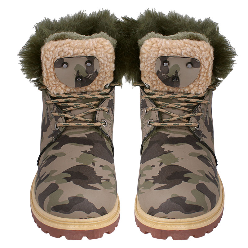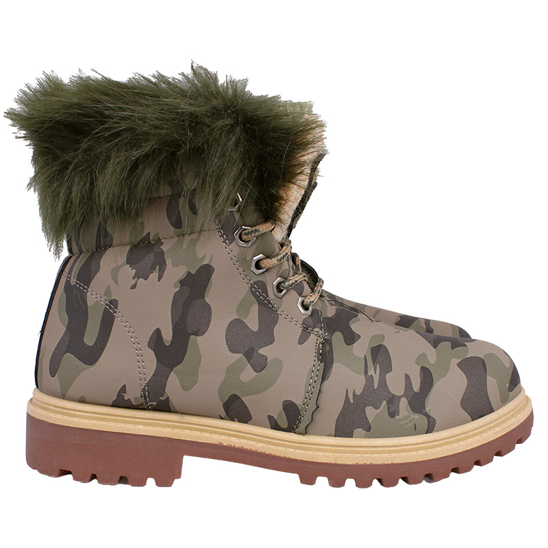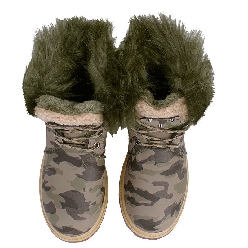 Ghete de iarnă pentru femei, în model camuflaj, cu șireturi. Interiorul este căptușit cu o blană moale și călduroasă, ceea ce face ca aceste ghete de iarnă pentru femei să fie ideale pentru vreme rece, activități în aer liber și drumeții. Talpa este realizată din poliuretan de înaltă calitate, caracterizat prin rezistență la impact, alunecare și ulei. Blănița fină din interiorul încălțămintei oferă o senzație plăcută de căldură chiar și în timpul zilelor geroase.