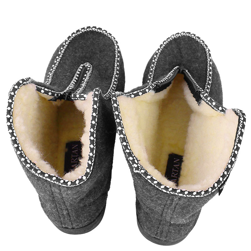 Specificații: Ghete din pâslă pentru gleznă de iarnă cu închidere cu fermoar din plastic, decorate cu broderie colorată, izolate cu blană textilă în partea interioară și talpă din cauciuc mai groasă.