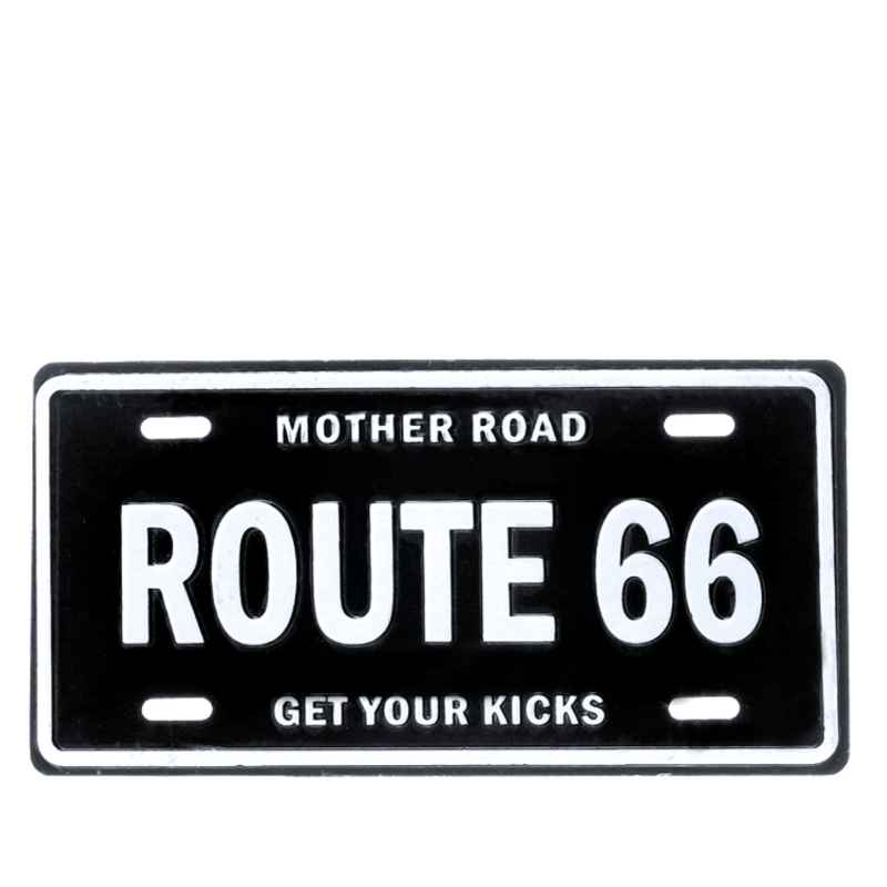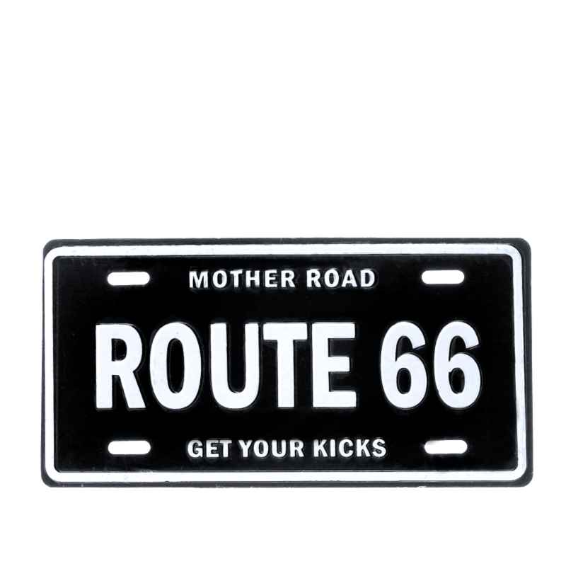 specificație: magnet din metal cu titlul melodiei „Get your kicks on route 66”, care se traduce prin „Bucură-te de aventură pe Route 66”, scrisă de compozitorul Bobby Troup și care a devenit un hit