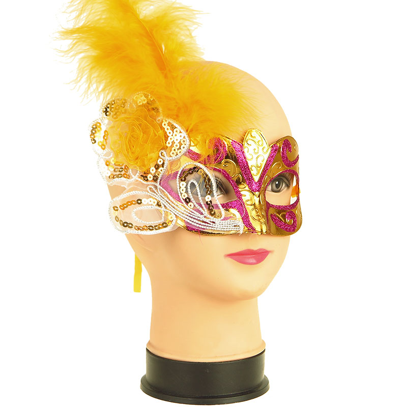 Masca de culoare aurie este decorată cu ornamente mov. Fabricată din plastic moale, decorată cu pene. Este potrivită pentru bal, carnaval sau alte evenimente festive. Se potrivește atât copiilor, cât și adulților. Se fixează cu un șnur.