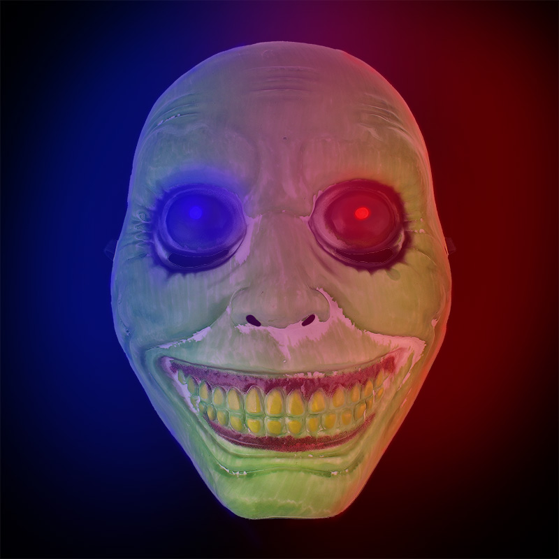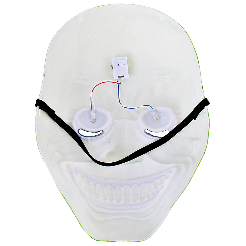 Mască înfricoșătoare sub forma unui monstru verde ca accesoriu ideal pentru carnaval, bal mascat, Halloween etc. În ochii măștii sunt lumini LED în culorile albastru și roșu. Sub ochii măștii se află găuri pentru ochi. Luminile LED sunt pornite cu ajutorul unui buton care se află în partea stângă a cutiei albe (în partea de sus a măștii), unde se află și bateriile. Între baterii este o bandă care trebuie îndepărtată - în caz contrar, luminile nu se vor aprinde. Butonul comută între trei moduri de iluminare: bliț, bliț lent și fără bliț. Bateriile sunt incluse și sunt deja în cutia lanternei.