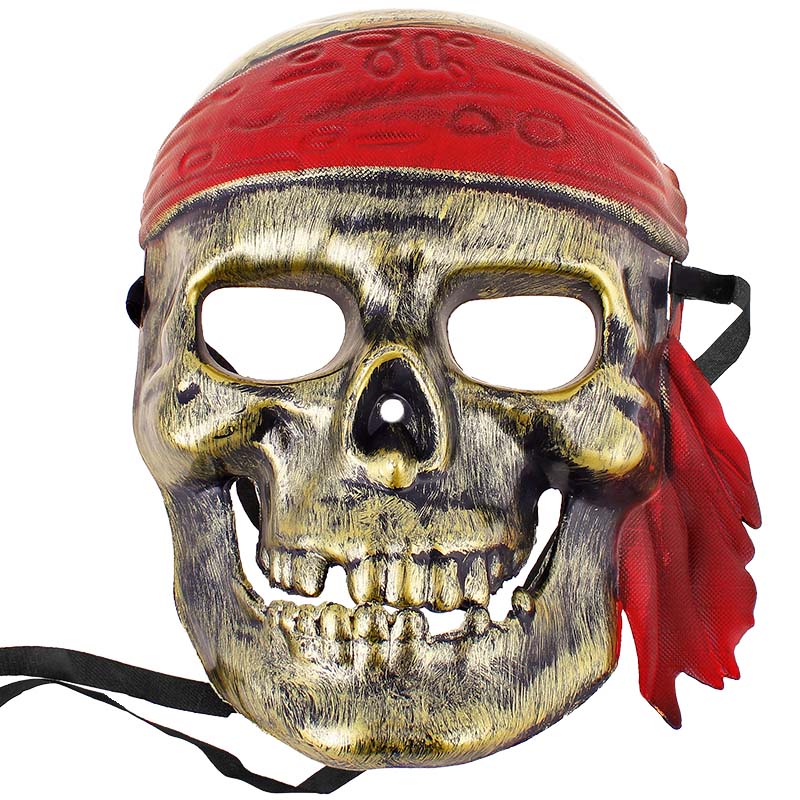 Mască de Halloween în formă de craniu de pirat potrivită pentru carnaval, bal mascat, halloween etc. Înălțimea măștii este de 21,5 cm, iar lățimea acesteia este de 15,5 cm. Masca este echipată cu o fundiță neagră pentru a fi legată în jurul capului.