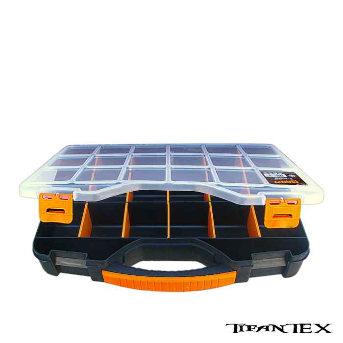 specificație: organizator portabil din plastic pentru obiecte mici, cum ar fi șuruburi, piulițe, cârlige de pescuit și momeli etc. Dimensiunea compartimentelor poate fi modificată prin îndepărtarea separatorului portocaliu, ajutor practic pentru garaj și locuință.