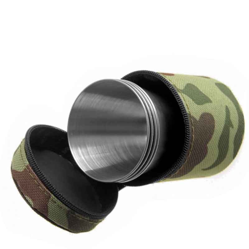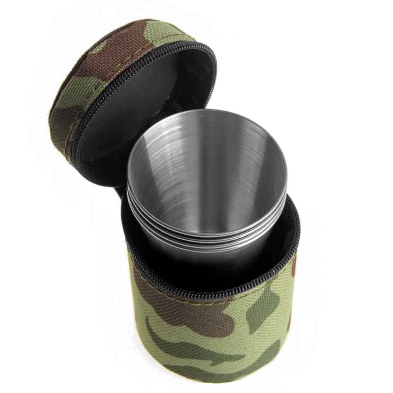 specificație: patru pahare din oțel inoxidabil cu o capacitate de aprox. 0,07 L într-o carcasă de camuflaj din nailon potrivite pentru camping, drumeție, călătorie etc.