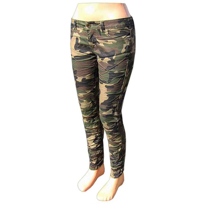 Specificație: blugi elastici de camuflaj pentru femei și fete cu aspect ușor șifonat, croială strânsă, închidere cu fermoar în față, talie înaltă la șold, rezistentă dar elastică, bucle pentru curea, 3 buzunare în față și 2 în spate