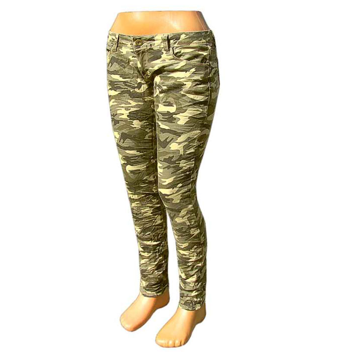 Specificație: blugi elastici și clasici de camuflaj pentru femei și fete cu croială mulată și aspect ușor șifonat, talie înaltă până la șold elastică și rezistentă, închidere cu fermoar în față, cu bucle pentru curea, 3 buzunare în față și 2 în spate