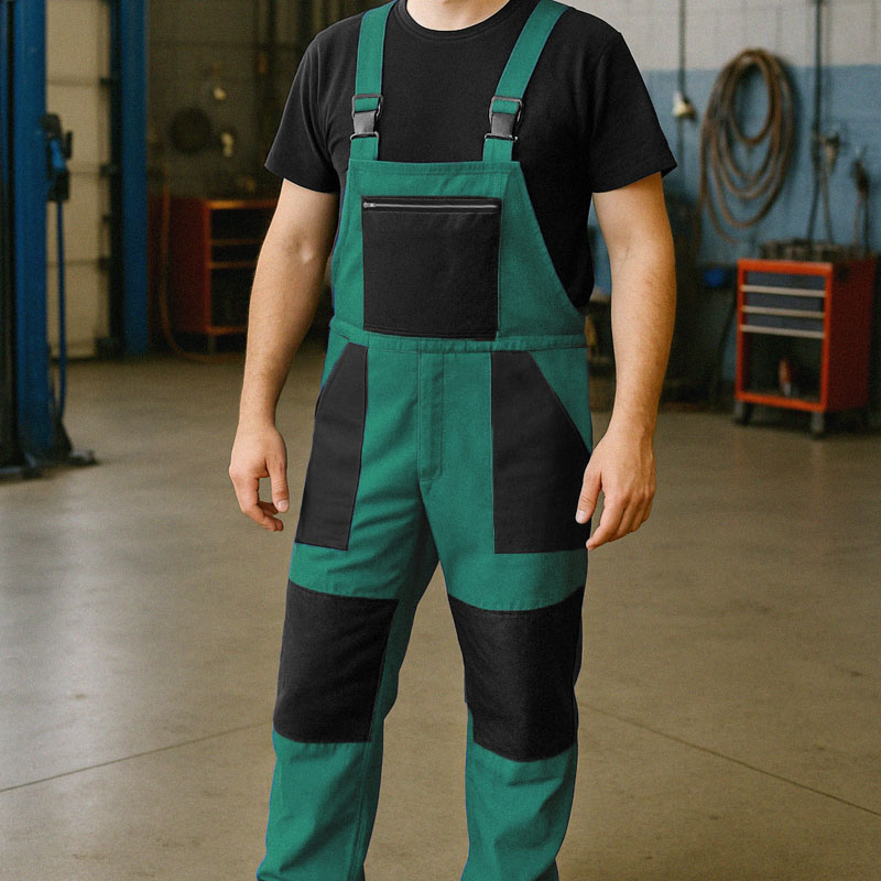 specificație: Pantaloni de lucru pentru bărbați, din bumbac, cu bretele și buzunare, întăritură la genunchi, închidere laterală cu nasturi, un buzunar lateral, două buzunare în față, un buzunar pe piept cu fermoar, un buzunar pe spate și genunchii întăriți sunt negri, elastic în talie la spate, reglarea lungimii cu ajutorul bretelelor