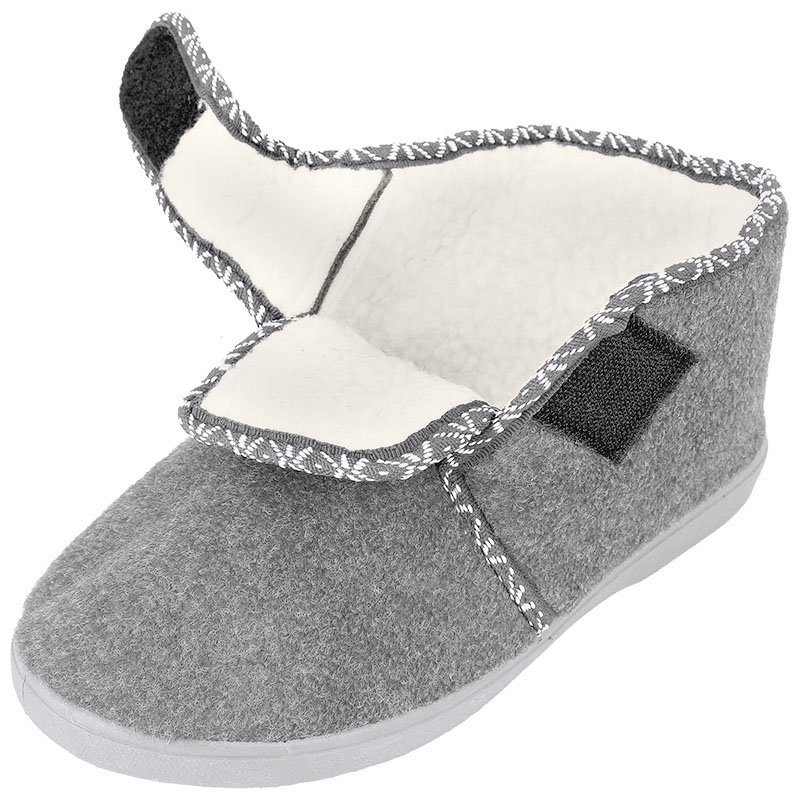 Pâslarii gri pentru seniori sunt alegerea ideală pentru cei care caută pantofi confortabili pentru casă și afară. Atât stratul superior, cât și cel interior al pantofilor sunt realizate din material pâslă moale, care este foarte plăcut la atingere. Datorită designului lor gros sunt potriviți pentru vremea caldă, dar și rece sau de tranziție. Închiderea se realizează cu scai. Talpa a fost realizată din poliuretan, ceea ce asigură stabilitate și rezistență corespunzătoare. Acești papuci din pâslă sunt atât încălțăminte de înaltă calitate, cât și un cadou ideal pentru un senior care are nevoie de papuci corespunzători.