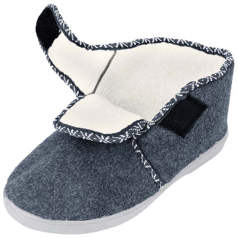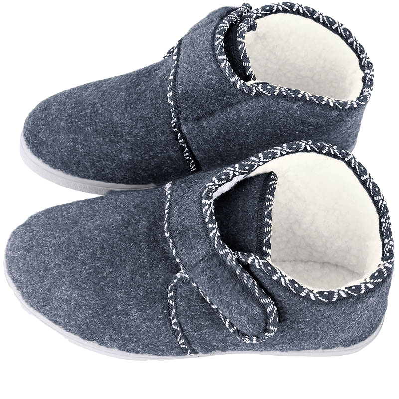 Acești papuci pentru damă sunt alegerea potrivită pentru cei care caută papuci confortabili din pâslă pentru uz casnic și afară. Atât exteriorul cat și interiorul pantofului este acoperit cu un material plăcut care este plăcut la atingerea piciorului. Datorită designului lor gros sunt ideali pentru lunile mai calde și mai reci ale anului. Închiderea se realizează cu scai. Talpa pantofilor a fost realizată din poliuretan, ceea ce creează stabilitate și rezistență ideală pantofilor.