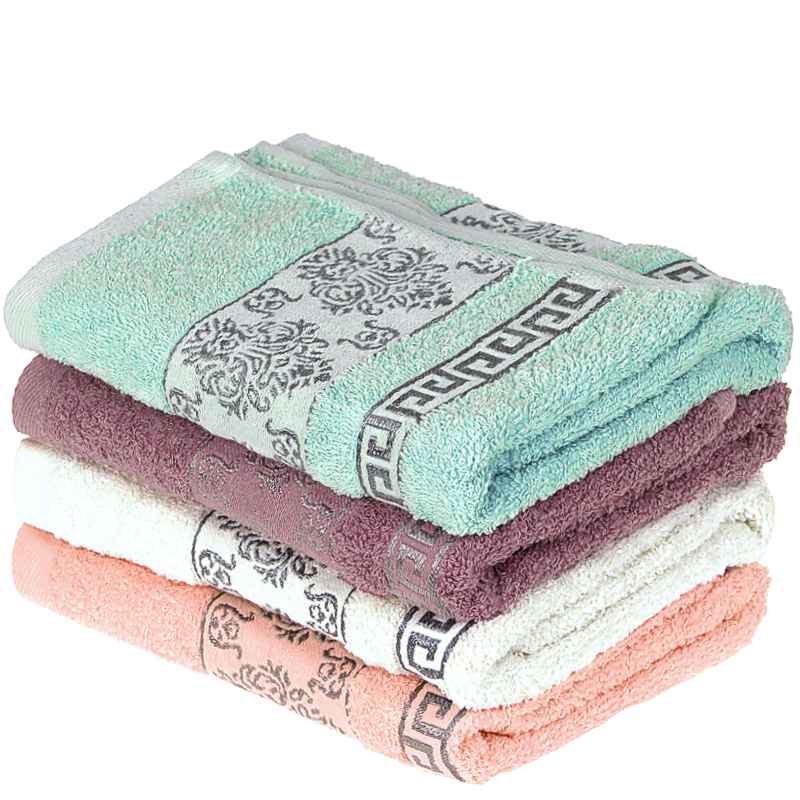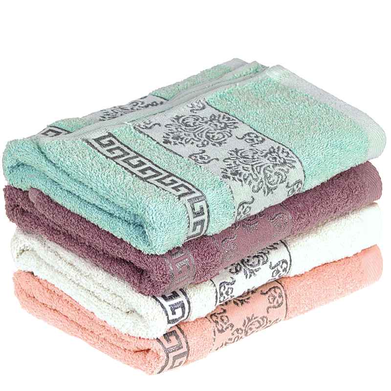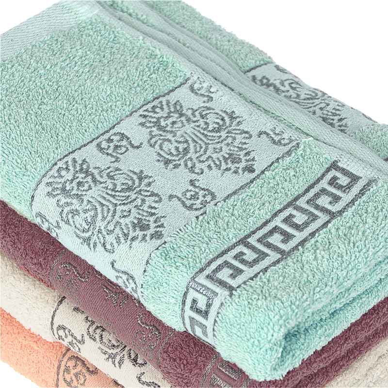 Specificație: Prosop din bumbac plăcut la atingere de mărime medie de 70x130 cm în patru culori: alb, roz, violet și turcoaz. Prosoapele sunt în culori pastelate plăcute. Pe una dintre laturile mai scurte, prosopul este decorat cu un model aztec cu ornamente. Prosopul are o absorbție bună. Una dintre laturile mai scurte este echipata cu o gaică practică pentru agățare.