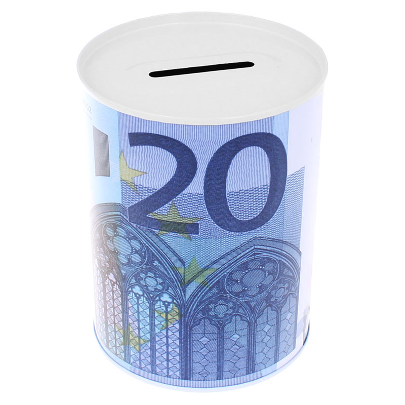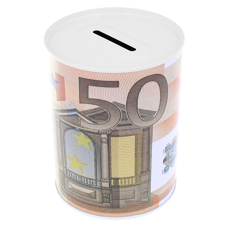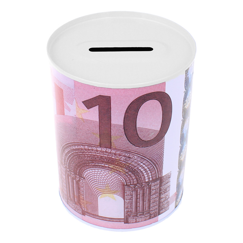 specificație: Pușculiță metalică în formă de conservă cu bancnotă euro imprimată, potrivită ca și un cadou pentru copii, tineri căsătoriți sau pentru a economisi bani pentru vacanță.