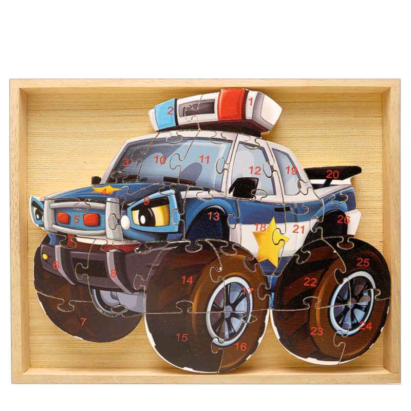 specificație: puzzle popular din lemn în formă de mașină de poliție din povești cu o stea șerif, imaginea mașinii de poliție este alcătuită din piese de diferite forme, care sunt numerotate de la 1 la 26