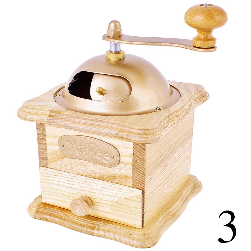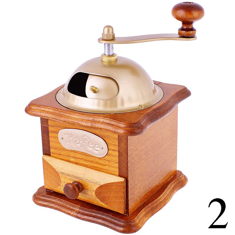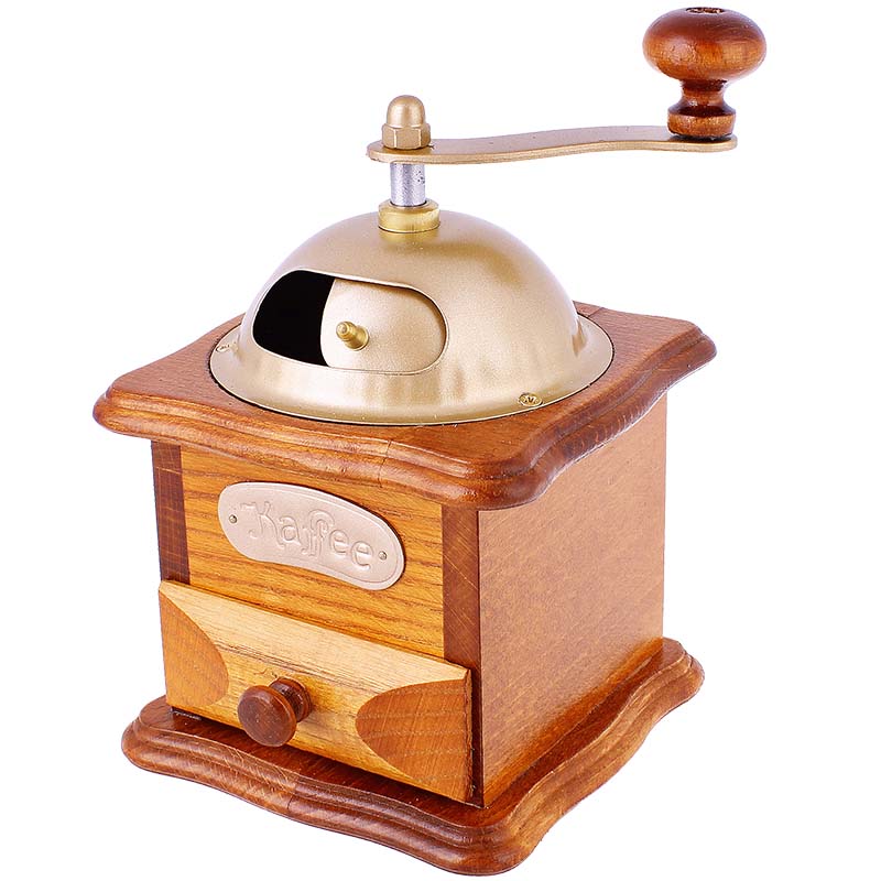 Râșniță retro de cafea complet funcțională, care vă va măcina boabele de cafea aromată și în același timp un obiect decorativ frumos și plăcut. Rezervor închis cu ușă pentru măcinarea cafelei prăjite cu mecanism de măcinare din metal. Cafeaua măcinată este turnată în sertarul din lemn detașabil.