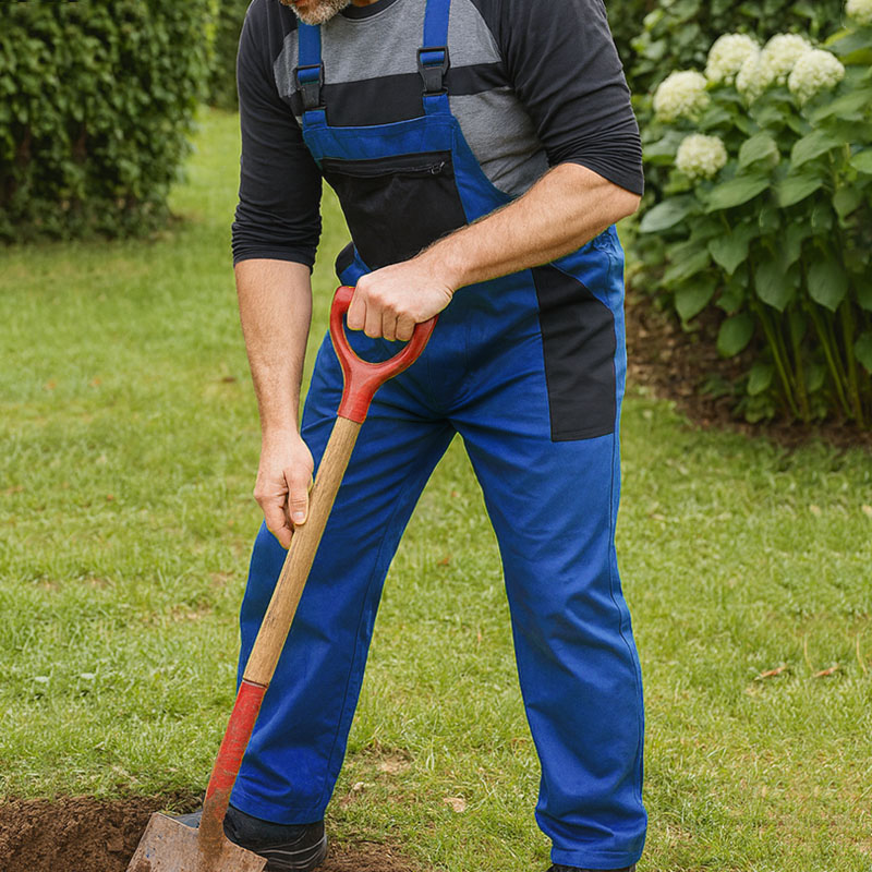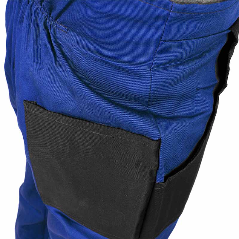 Pantaloni de lucru cu bretele pentru bărbați în albastru. Această salopetă este fabricată în Slovacia și are două buzunare frontale, un buzunar pe spate și un buzunar lateral la înălțimea genunchilor. Pantalonii ieftini pentru bărbați cu bretele au și un buzunar frontal la piept cu închidere cu fermoar. Talia se închide cu nasturi, la fel ca și închiderea laterală a pantalonilor. Reglarea lungimii bretelelor este rezolvată de o cataramă simplă din plastic și un nasture. Salopetă simplă și necostisitoare pentru purtarea obișnuită. Se poate spăla până la max. 40°C.