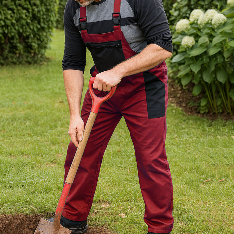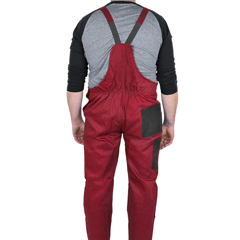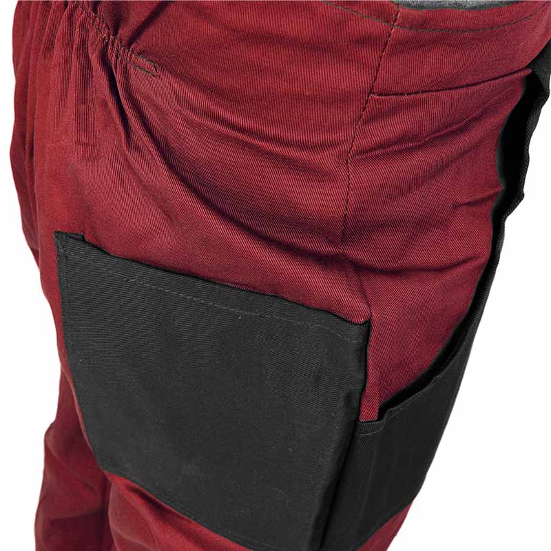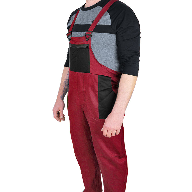Pantaloni de lucru cu bretele pentru bărbați în roșu. Această salopetă este fabricată în Slovacia și are două buzunare frontale, un buzunar pe spate și un buzunar lateral la înălțimea genunchilor. Pantalonii ieftini pentru bărbați cu bretele au și un buzunar frontal la piept cu închidere cu fermoar. Talia se închide cu nasturi, la fel ca și închiderea laterală a pantalonilor. Reglarea lungimii bretelelor este rezolvată de o cataramă simplă din plastic și un nasture. Salopetă simplă și necostisitoare pentru purtarea obișnuită. Se poate spăla până la max. 40°C.