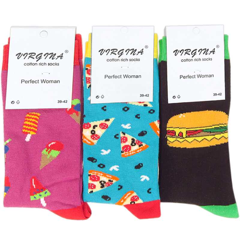 specificație: șosete de damă din bumbac de la producătorul confirmat de șosete Virgina, pachetul conține 3 perechi de șosete haioase cu diverse răsfățuri. Șosetele amuzante pentru damă, care înfățișează delicii precum gogoși, hamburgeri, pizza și gogoașă sunt potrivite pentru purtare zilnică, dar cu siguranță nu pentru evenimente oficial din punct de vedere social. Purtați acești șosete stilate la întâlniri informale, la plimbări, în natură sau la grătar în grădină.