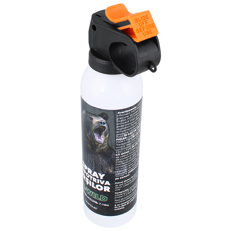 Un mijloc de autoapărare eficient și de înaltă calitate în cazul unei întâlniri cu un urs, creând condițiile perfecte pentru a respinge cu succes un atac. Duza descarcă un amestec de substanțe care conțin iritanți precum OC, CR, CP și CS. Duza pulverizează substanța sub forma unui nor, făcând mai probabil ca animalul să fie lovit de spray. Acest spray pentru urși este un instrument de autoapărare ideal, cu un efect paralizant care, atunci când își atinge ținta, va provoca aproape imediat arsuri grave ale pielii, lăcrimare, închiderea forțată a ochilor și iritații respiratorii. Un agresor lovit de spray lacrimogen are o percepție limitată, are dificultăți de respirație și pierderi de coordonare. Toți acești factori provoacă o imposibilitate temporară a oricărui atac deliberat.
