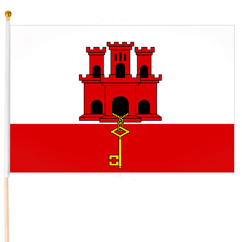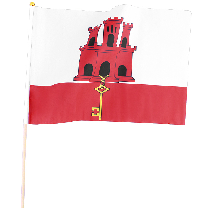 Gibraltar este un teritoriu de peste mări al Regatului Unit și este situat în sudul Peninsulei Iberice, în cel mai îngust punct dintre Marea Mediterană și Oceanul Atlantic. Din punct de vedere strategic, este o locație foarte importantă, permițând controlul singurei strâmtori dintre Atlantic și Marea Mediterană. Prin urmare, steagul Gibraltarului conține un castel (care nu este asociat cu niciun castel din Gibraltar) și o cheie care indică această locație strategică, „cheie” în Marea Mediterană. Steagul este montat pe un stâlp de 61 cm lungime și este acoperit cu o bilă aurie din plastic. Pentru producerea steagului a fost utilizat poliester. Steagul este potrivit ca o decorațiune pentru locuință, afaceri sau ca simbol în timpul evenimentelor sportive.