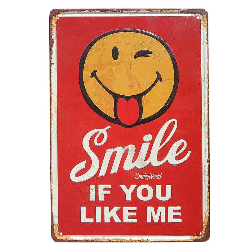 specificație: tablă metalică retro cu un emoticon amuzant și imaginea Smile if you like me, potrivită ca decorațiune de perete acasă, în birou, în club, la cabană, etc.