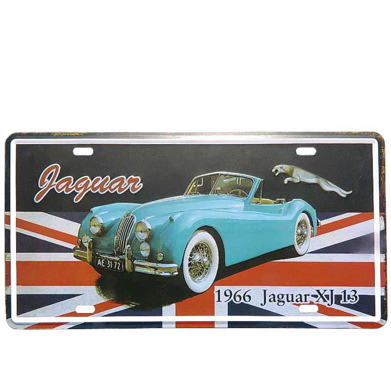 specificație: tablă publicitară retro cu mașina engleză de epocă Jaguar XJ 13 1966, potrivită ca decorațiune de perete în cabană, garaj, club auto, birou, service auto, etc.