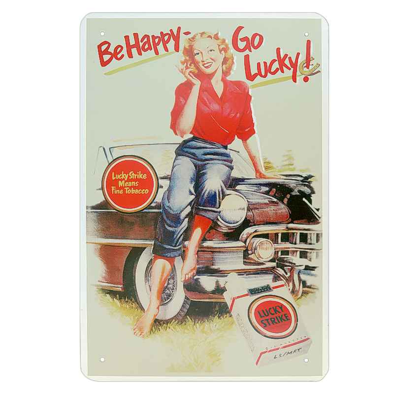 specificație: tablă mică retro din metal de 20 x 30 cm ca reclamă la țigările LUCKY STRIKE cu imaginea unei domnișoare drăguțe. Imprimeu de înaltă calitate pe o bază metalică cu patru găuri pentru prindere sau bătut în cuie pe perete