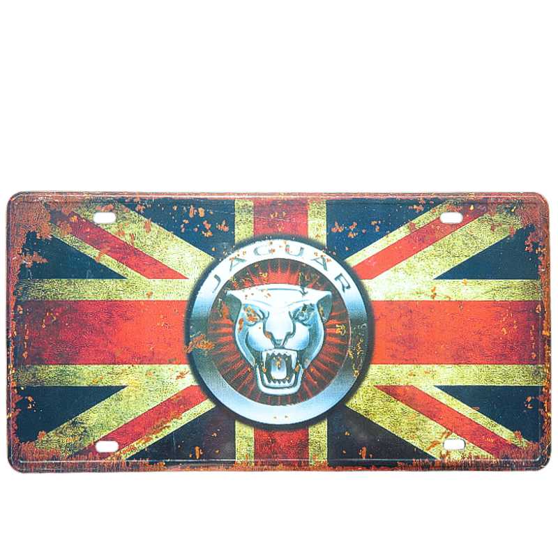 specificație: mică tablă metalică retro 30x15 cm, care prezintă simboluri ale Marii Britanii, cum ar fi steagul și marca auto Jaguar, imprimeu de înaltă calitate pe o bază metalică cu patru găuri pentru prindere sau bătut în cuie pe perete