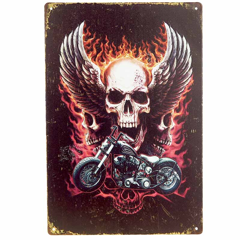 Tablă metalică cu un design al unui craniu cu aripi împreună cu o motocicletă. Acest semn metalic este ideal ca ornament de casă pentru persoanele cărora le plac decorațiunile similare. Acest semn metalic a fost realizat din tablă. Dimensiunile plăcuței sunt de 30 x 20 cm (Î x L).