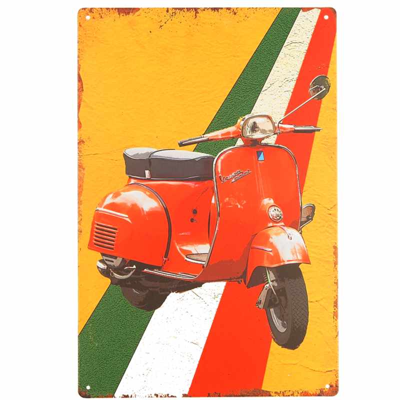 Tablă metalică cu motivul legendarului scuter Vespa pe un fundal cu culorile drapelului italian. Tabla de semnalizare este potrivită ca o decorațiune de apartament sau casă. Se va potrivi perfect într-o cameră care este aranjată într-un stil retro/vintage. Dimensiunile tăbliței sunt de 20 x 30 cm (l x î).