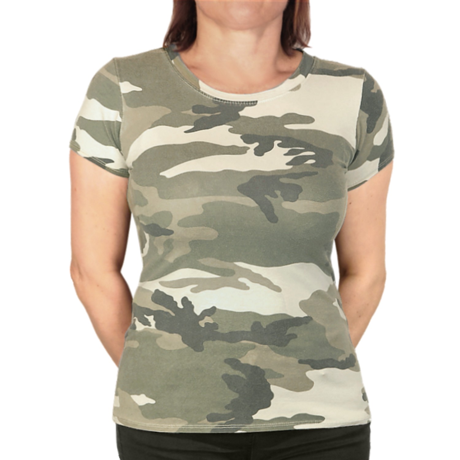 Descriere: Tricou ușor elastic pentru damă cu model de camuflaj camo woodland de la brandul Royal Belle. Tricou tricotat cu mânecă scurt din bumbac 100% natural, este plăcut la atingere și confortabil la purtare. Materialul este ușor, plăcut și aerisit. Designul de camuflaj oferă o impresie spălată și lejeră. Gâtul este finisat cu brevet tricotat, mânecile și partea de jos a tricoului sunt finisate cu o simplă tivită și cusătură pe spate. Tricou este plăcut la atingere și asigură în același timp o bună absorbție a transpirației, potrivit pentru zilele toride de vară.